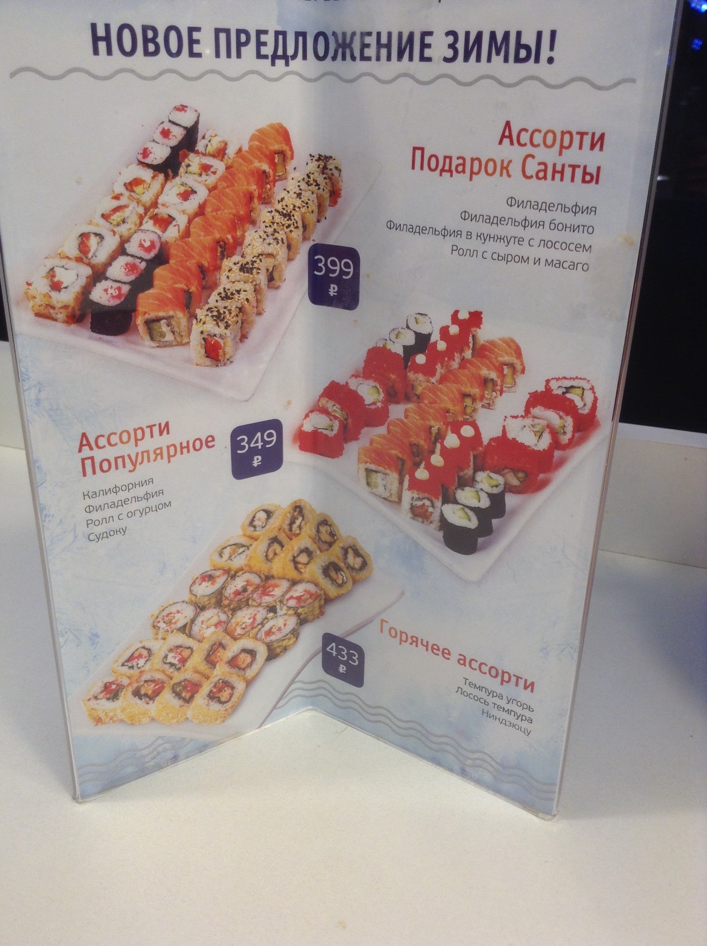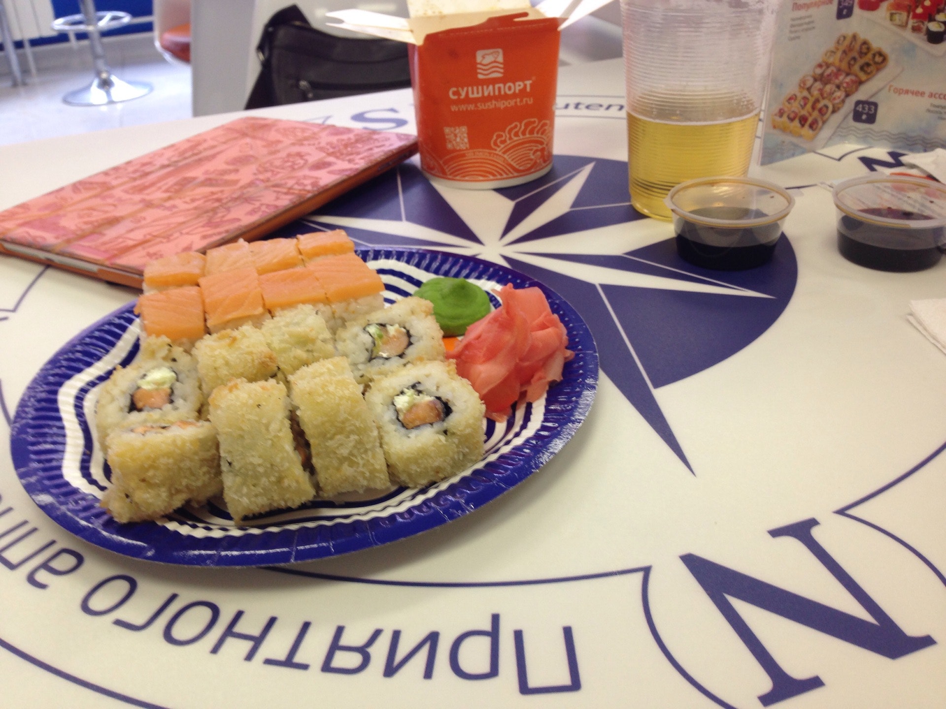 Цены отличаются от сушипорта на педе (выше). Приятный дизайн, хорошие роллы, быстро готовят. Из напитков берите бутилированное. Кофе ужасный, как из любого недоавтомата.